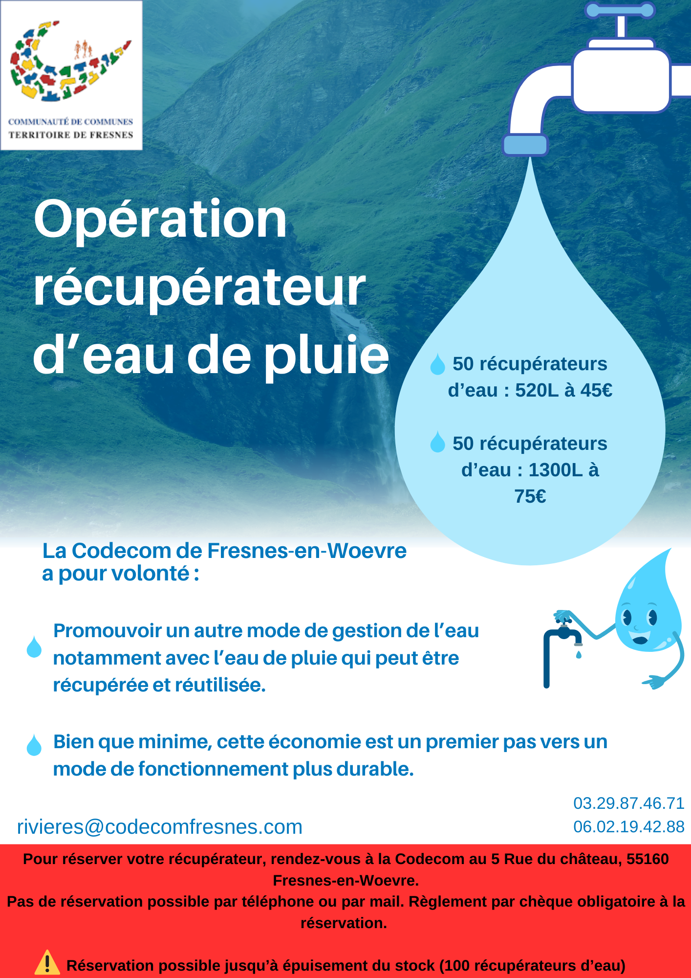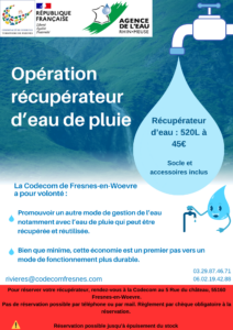 Vous pouvez dès à présent vous rendre à la Codecom de Fresnes-en-Woëvre afin de réserver votre récupérateur d’eau de pluie.